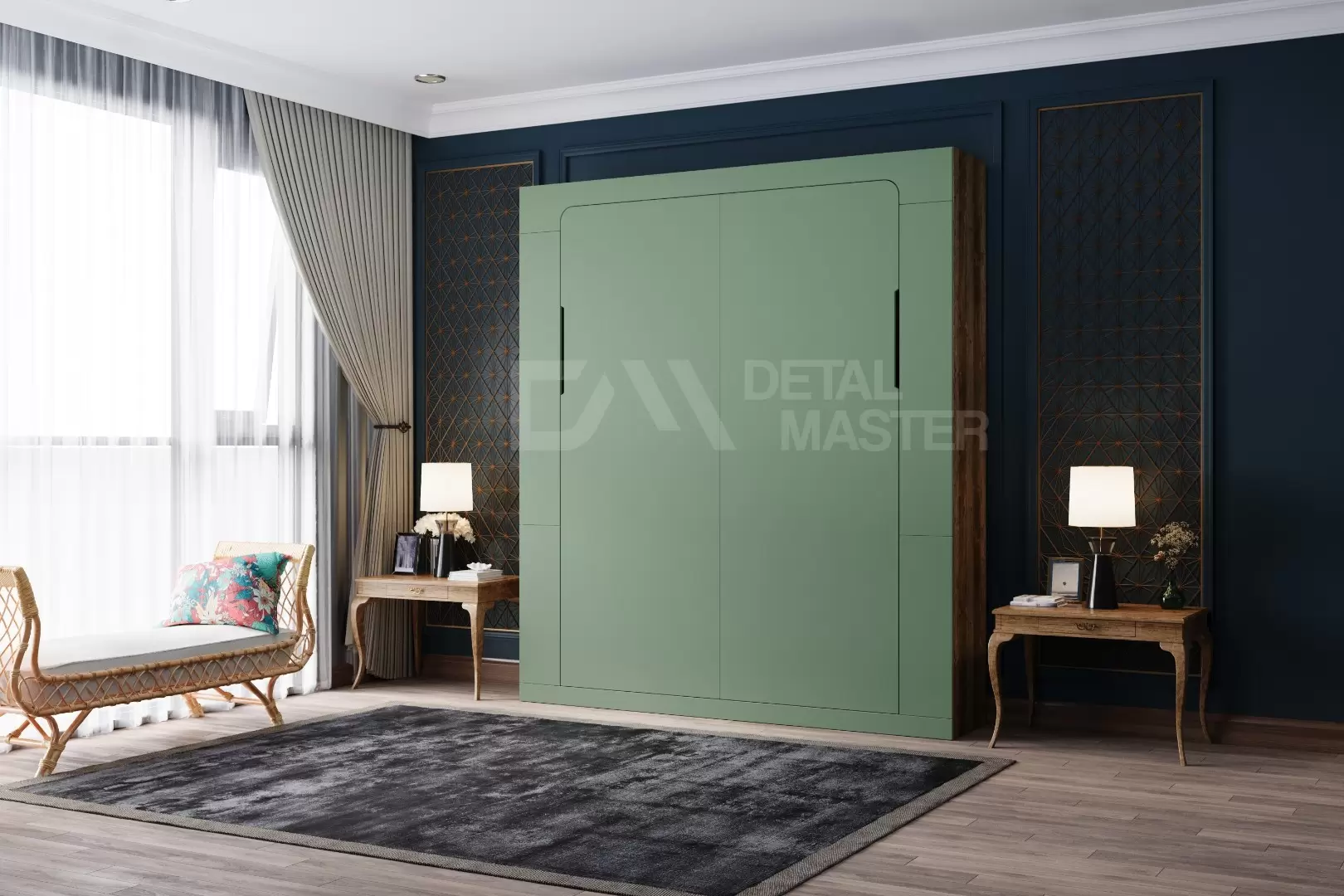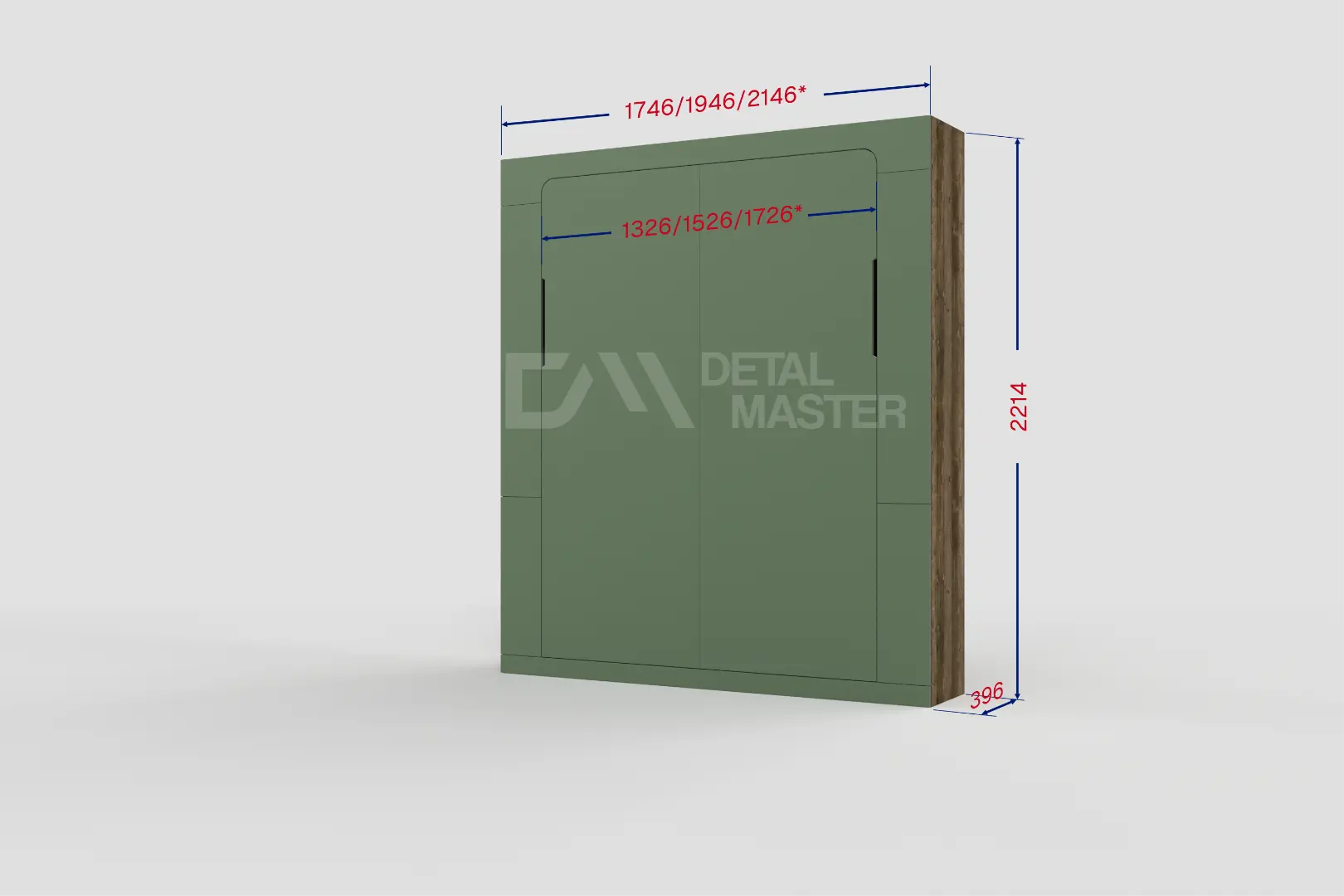 Фасад шкаф-кровати выполнен из МДФ супер матовый Фисташка, со сглаженными краями. Что позволит обезопасить вас от ударов при ходьбе возле кровати в разложенном положении и добавит изысканность модели шкаф-кровати. Корпус выполнен из ЛДСП декор Кейптаун. По бокам модель оснащена полками для хранения вещей с закрывающимися дверцами.